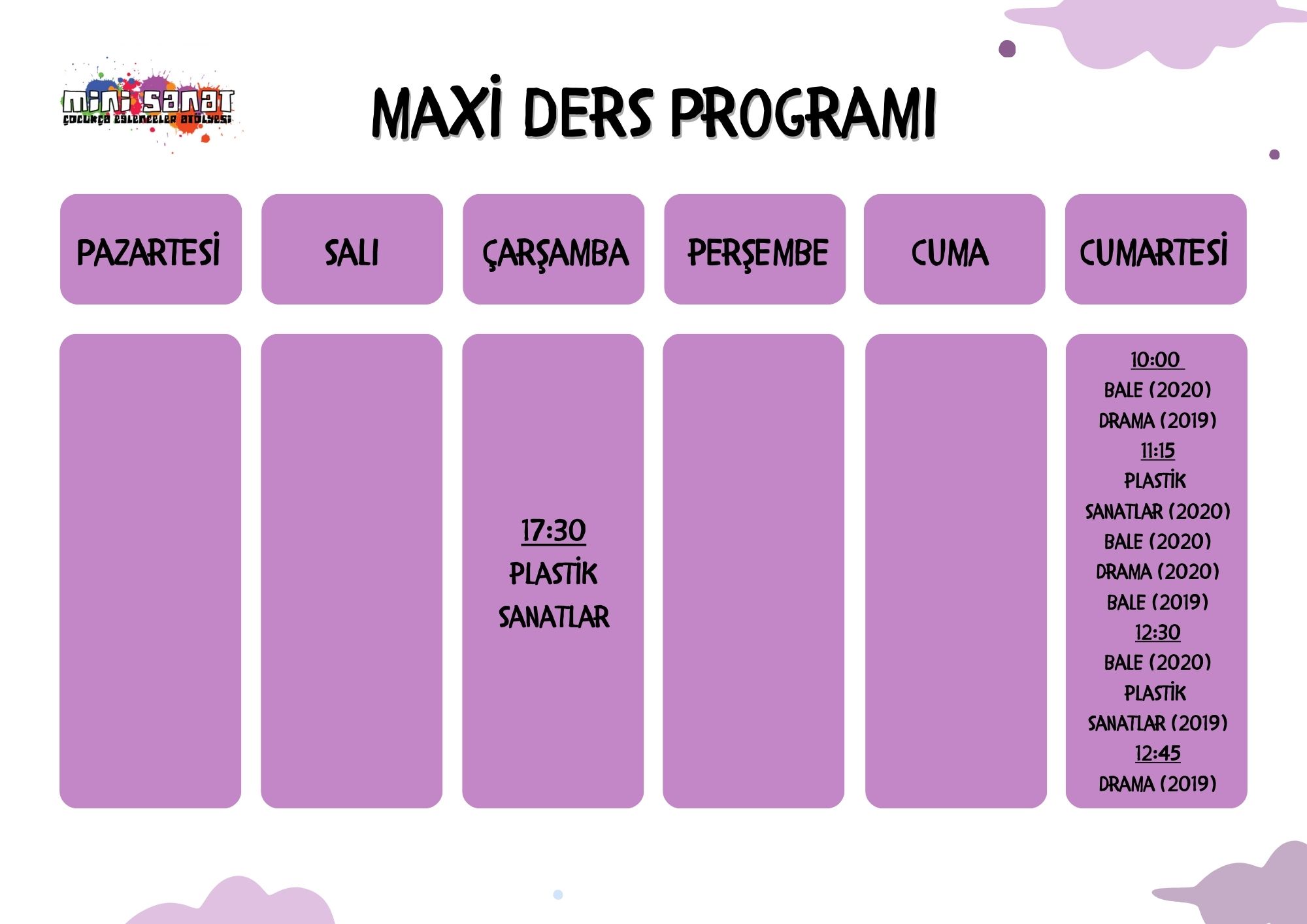 2019 ve 2020 doğumlu çocuklar için grubumuzun hafta içi ve hafta sonu olmak üzere katılabileceğiniz iki ayrı programı bulunmaktadır. Hafta içi katılabileceğiniz gruplar talebe göre oluşturularak, okuldan sonra 16.30-18.30 saatleri arasında programlanmaktadır. Hafta sonu cumartesi günü olan programımız ders saatlerine göre 10.00-18.30 arasında uygulanmaktadır. Bu programda bale, drama, plastik sanatlar ve özel enstrüman dersleri bulunmaktadır. Kursumuz, Milli Eğitim Bakanlığına bağlı bir kurum olup sene sonunda düzenli katılım gösterdiğiniz kurs ya da kurslardan MEB onaylı belgeler tarafınıza verilmektedir. Ayrıca yaş grubumuz için sömestr tatillinde kış okulu, yaz tatilinde yaz okulu programlarımız yapılmaktadır. Bu programlar tatillerden önce belirlenerek kayıta açılmaktadır.